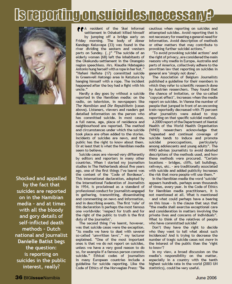 When I moved to Namibia in February 2006, I did what I always do when arriving in a foreign land: buy the papers. One of the first things that struck me was the way the Namibian mainstream press reported on suicides. Unlike in most countries, suicide reports here appeared on a daily basis, often including a detailed description of the method used. After a conversation in the newsroom of The Big Issue Namibia the editor asked me to write an opinion piece on the topic.
