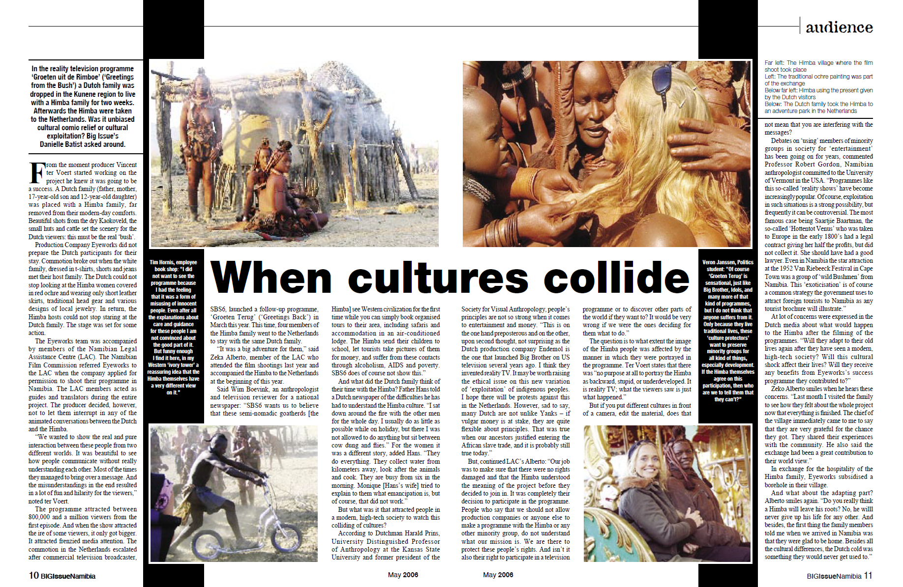 Having seen the outrage about the programme in Holland, I was keen to investigate the story from inside Namibia. I wrote this report for The Big Issue Namibia during my time as a staff reporter for the magazine in 2006.