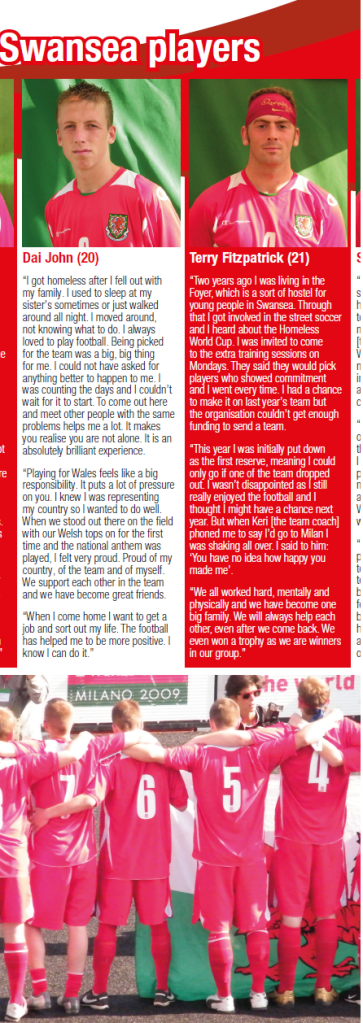 “We will always help each other, even after we come back”, Terry told me back in 2009. With a polite but proud smile, he filled me in on the progress he has made since we last met: he has gone back to university to study social inclusion and restored contact with his family. After years of volunteering, he got his dream job as a support worker at Street Football Wales.
