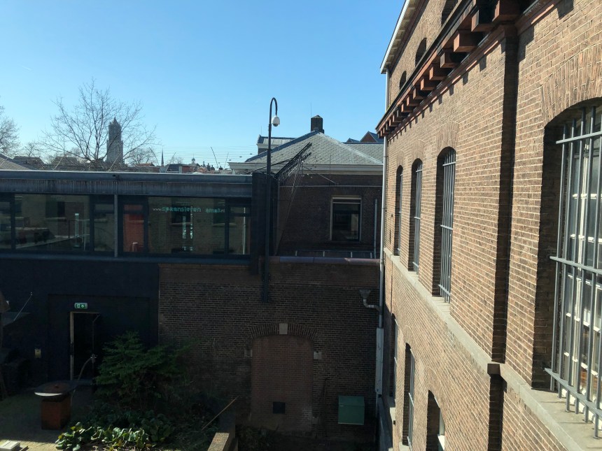 UTRECHT, NETHERLANDS – Walking along the corridors of the creative work space that is housed inside the Wolvenplein prison, reminders of the building’s long history are everywhere. The heavy cell doors with tiny break-proof windows now lead to small offices. When tenants sit outside on their lunch break, they look out on the thick brick walls topped with barbed wire. In the kitchenette, instruction posters next to a large sink offer a step-by-step guide to drug-testing urine samples.